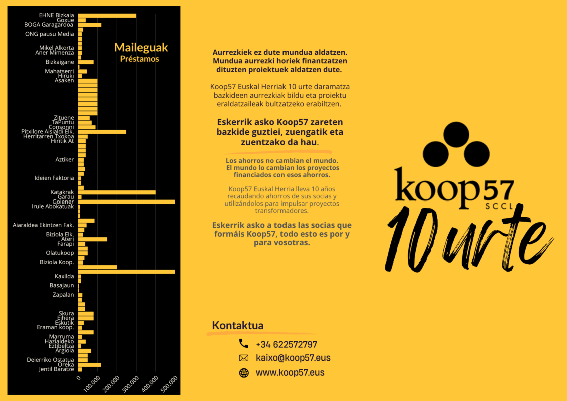 Finantza etiko eta solidarioen kooperatibak urteurrena ospatu du Gasteizen. Euskal Herriko 80 entitatek eta 330 norbanakok 4 milioi euro aurrezten dituzte Koop 57n. Haiei esker, 5,6 milioi euro eman dira guztira 86 mailegutan.
